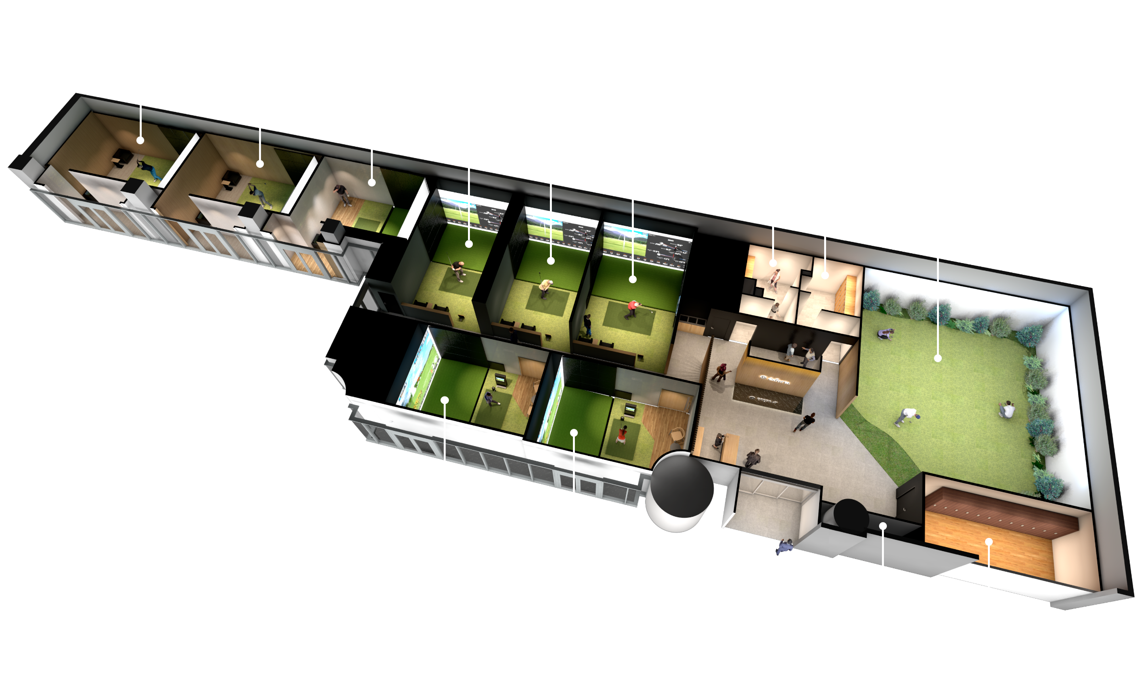 長尺ドライバーもフルスイング可能な約 4m × 6 m(約 24 ㎡ )の広々とした打席をご用意。振り上げたときに左右の壁が気になることもありません。