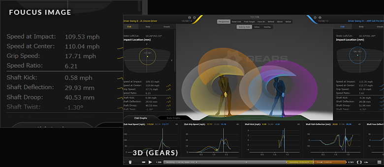従来の2Dビデオ撮影に比べ、モーションキャプチャ技術を用いた3次元スイング解析システム「GEARS」は、スイングのモーションやヘッドの動き、シャフトのしなり、スイング時の肩や腰、膝の角度など、30項目以上の動きを数値化するシステムです。